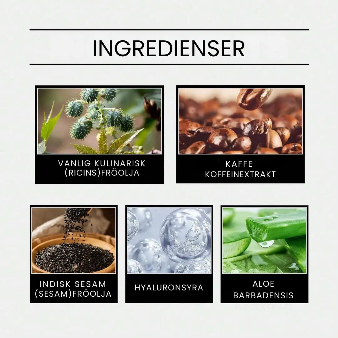 Ricinus Communis (Castor) Seed Oil, Caffeine Extract, Sesamum Indicum (Sesame) Seed Oil, Aloe Barbadensis Leaf Extract, Hyaluronic Acid, Boswellia (Frankincense) aroma.